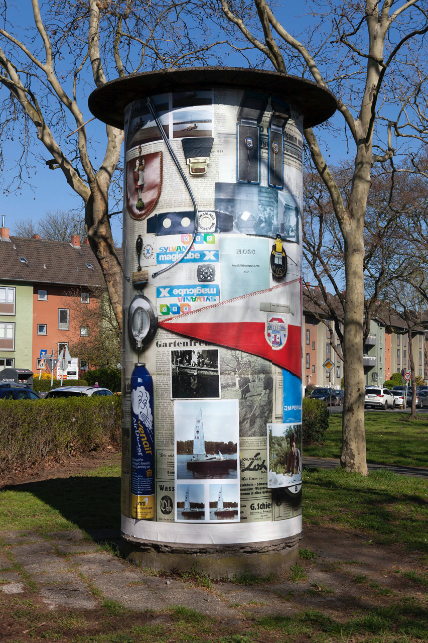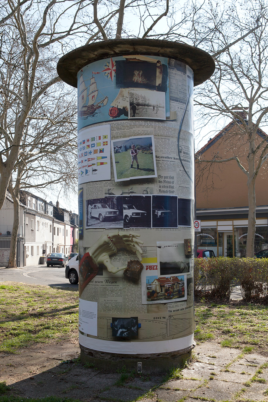 The ongoing art pillar project initiated by the City of Cologne, Medienhaus Ströer and Academy of Media Arts, Cologne enabled me to show my photographic collages "Opa 1" and "Opa 2" on 25 former advertising pillars spread around the city of Cologne. For me this was a wonderful possibility to show my work outside of a gallery or museum and bring it to the street. I especially liked the round format of the pillar, which allows the passers by to look at the work from all angles and so form a real connection with the spaces and obstacles surrounding the works.