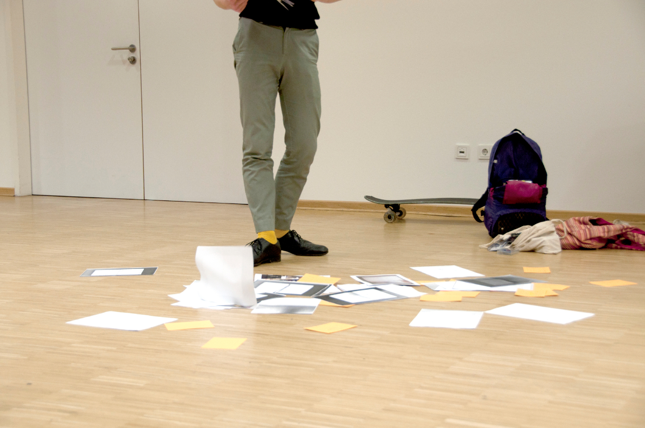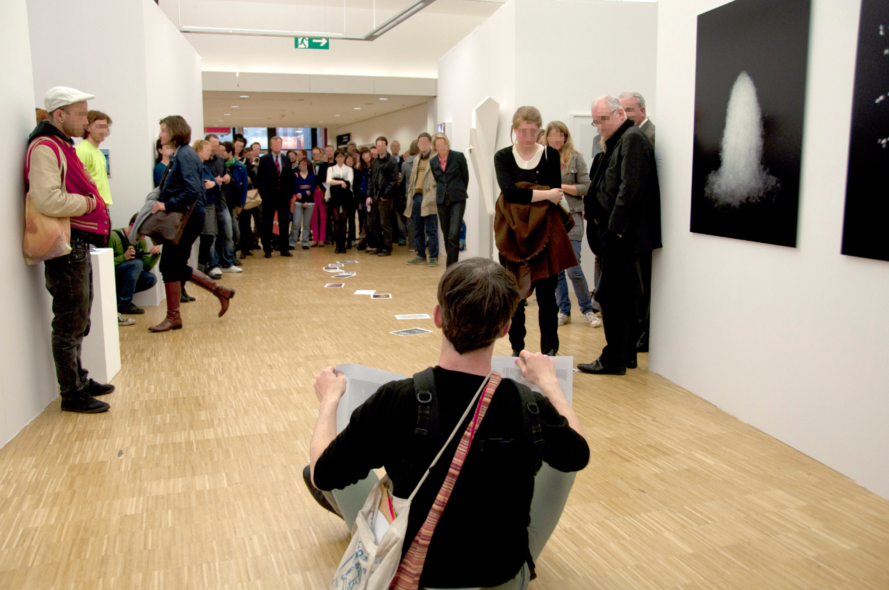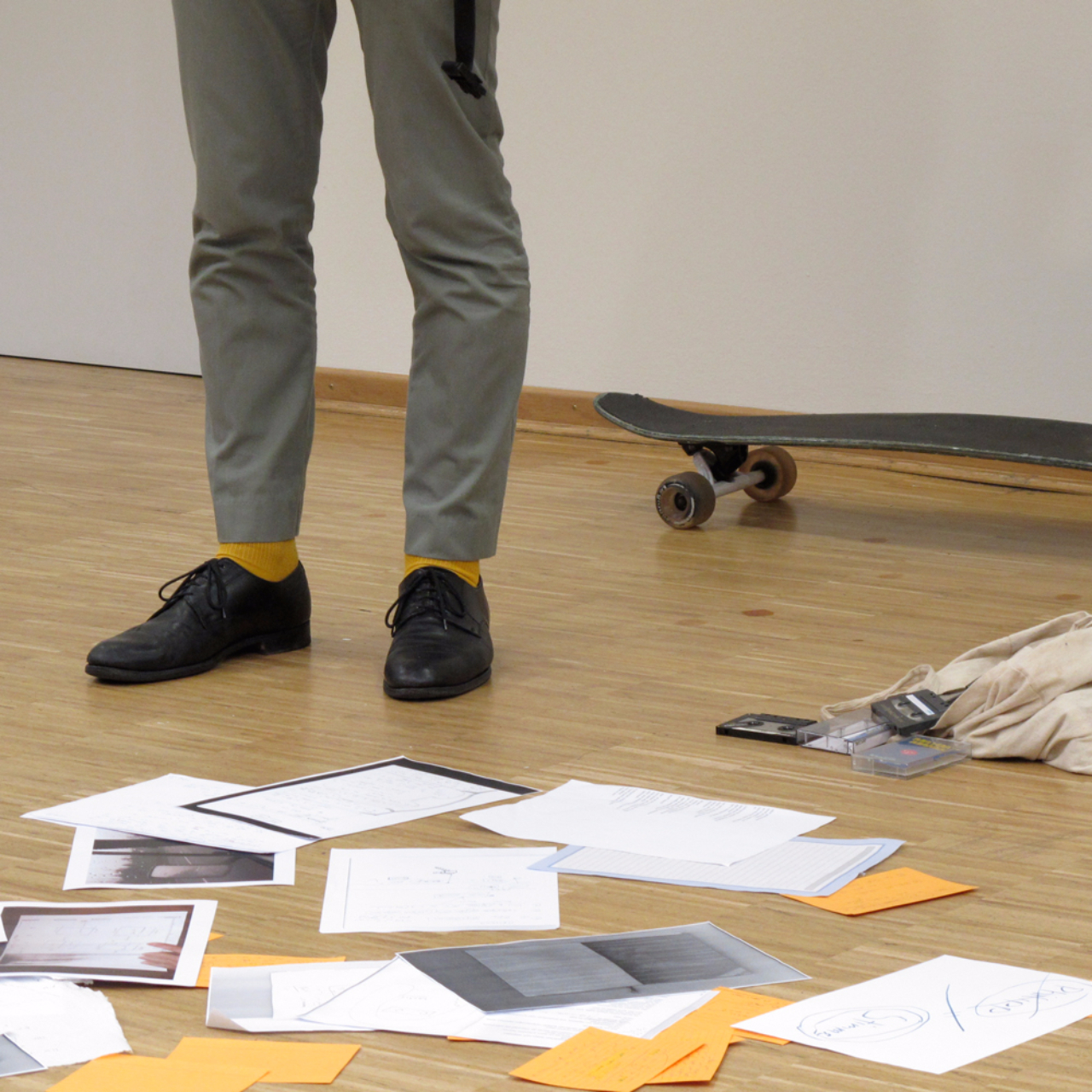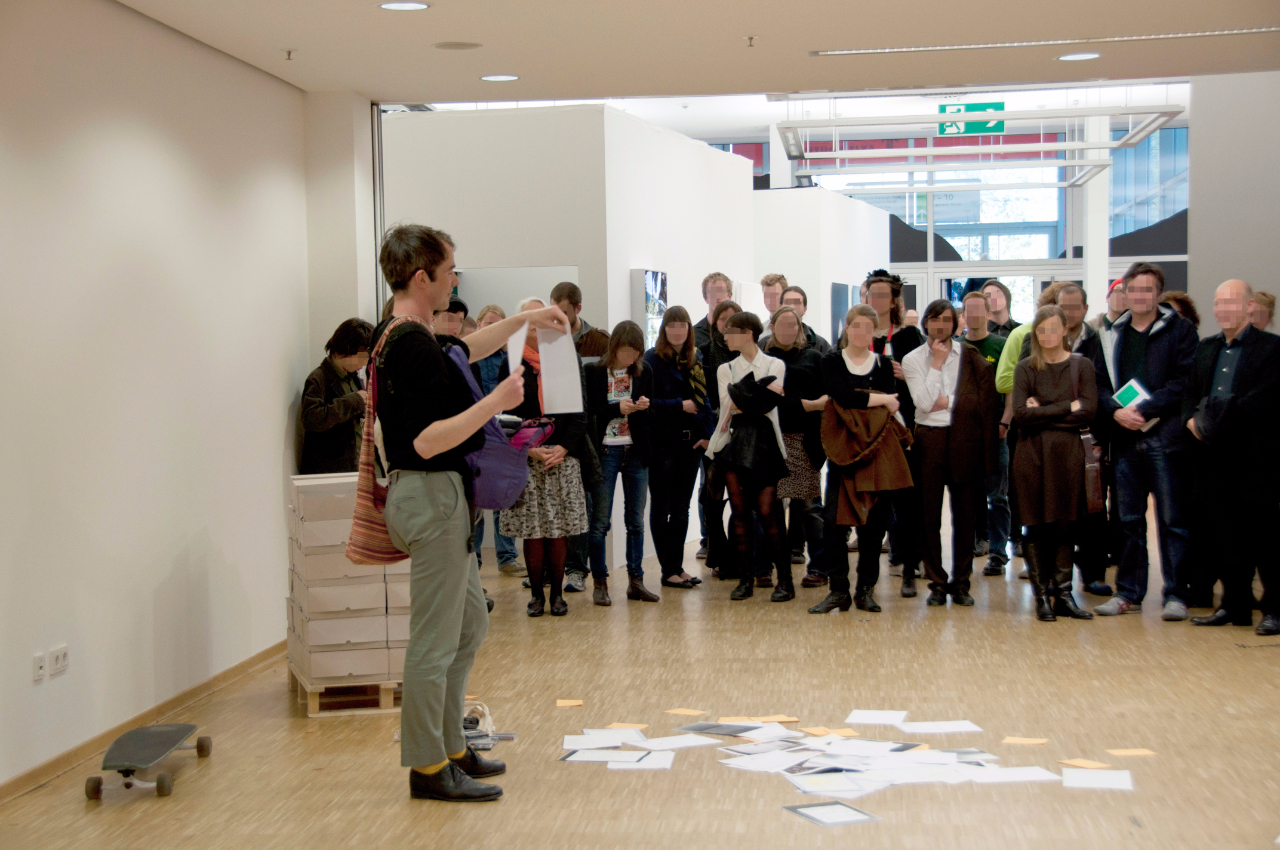 The disembodied voice – a pre-recorded audio cassette and a loudspeaker – guides a young performer (the body). The performer follows the instructions, which he has not heard before. He shows the audience photographs relating to the narrator's story, and slowly leads the crowd out of the exhibition hall and into the open outside space, where he reunites with the voice with it's owner.