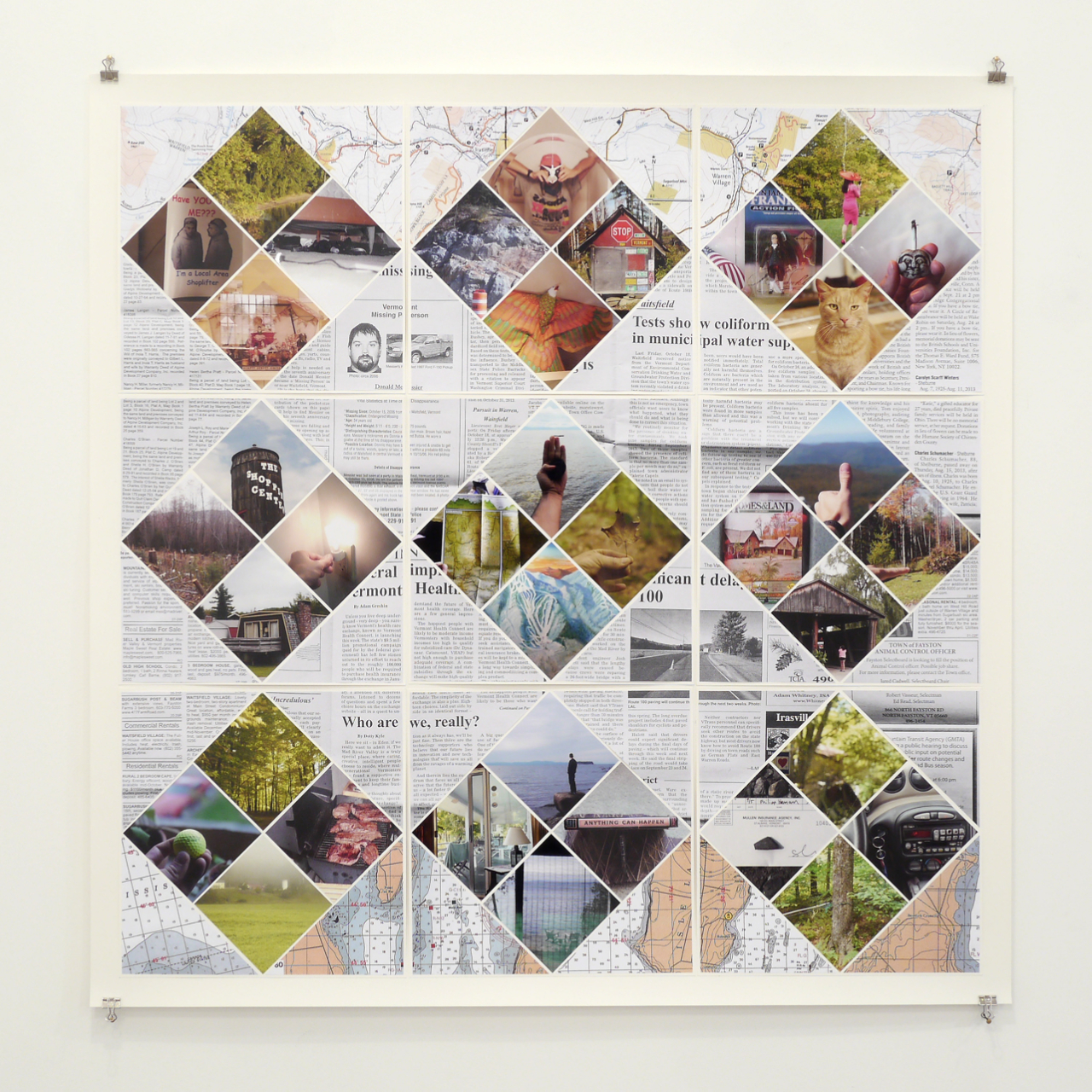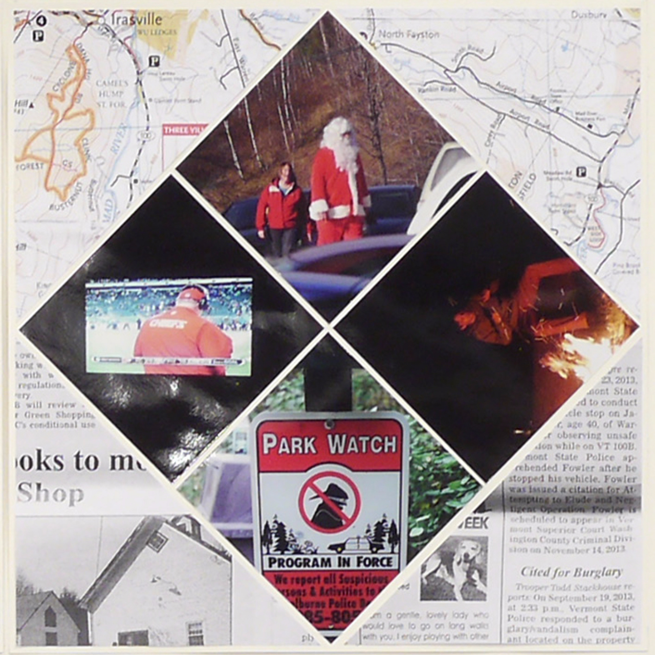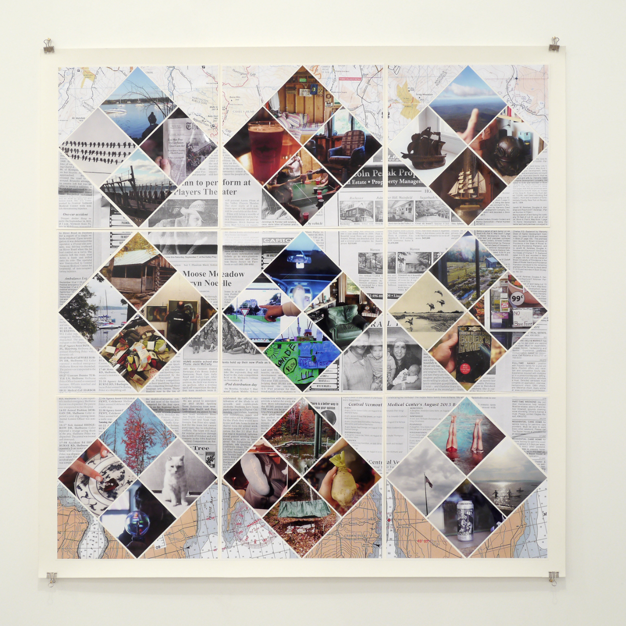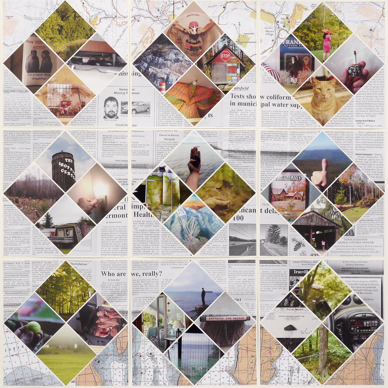 The patchwork technique is ubiquitous in Vermont in the form of quilts. Transferred to paper, I made quilts in the three colors of the landscape: the green of the forests, the blue of Lake Champlains and the red of the leaves during the “Indian Summers”. The top and bottom are framed by maps of Lake Champlains and the mountainous Mad River Valley. In between there are copies of newspaper clippings from the “Valley Reporter” and photos from the trip sorted by color.