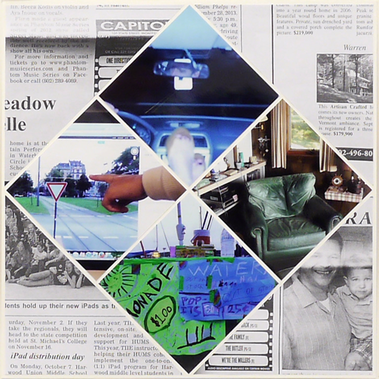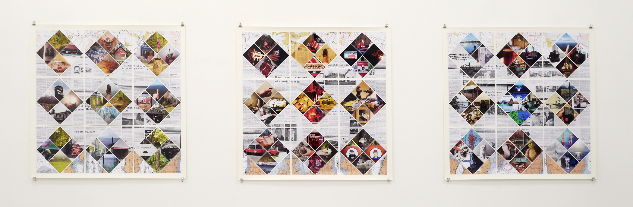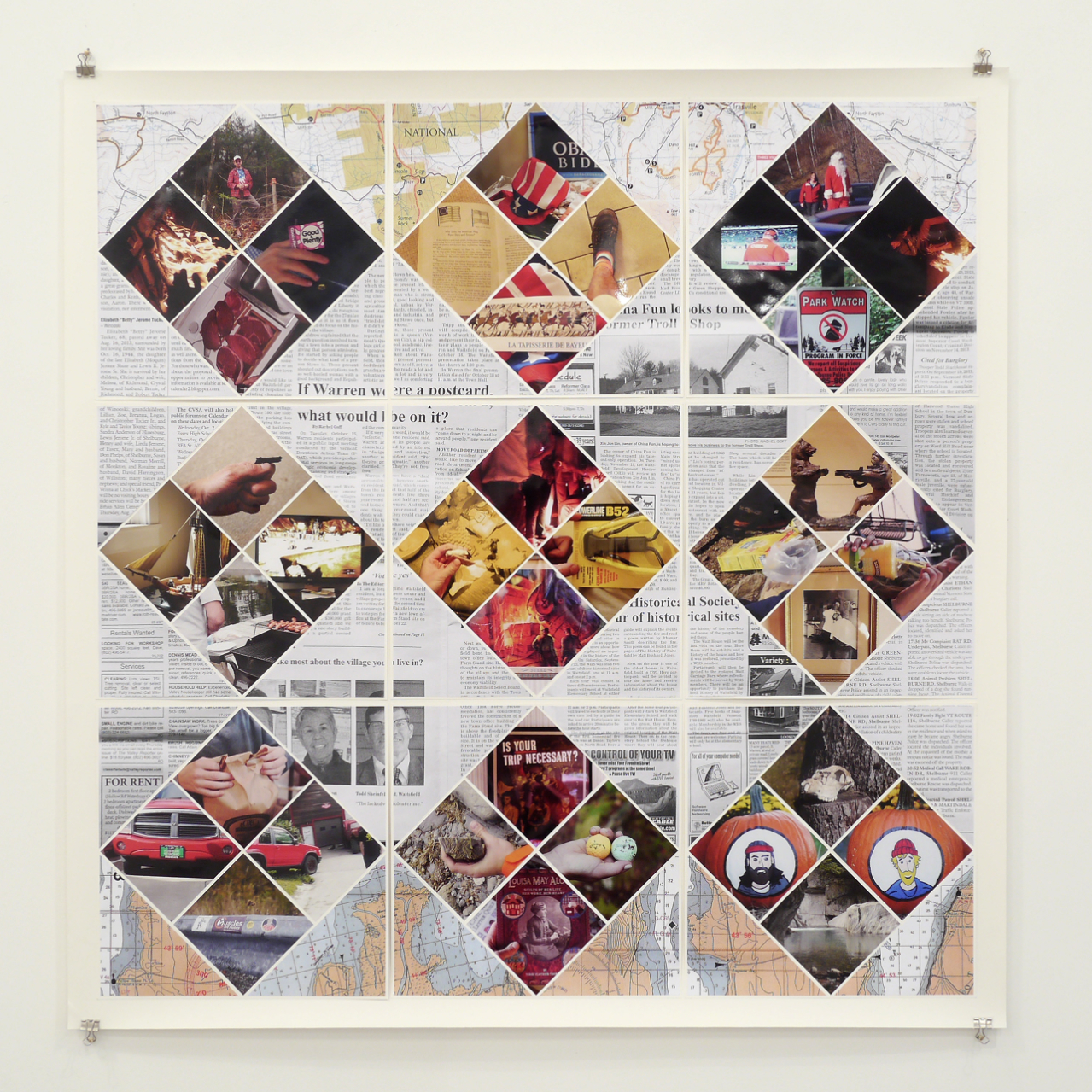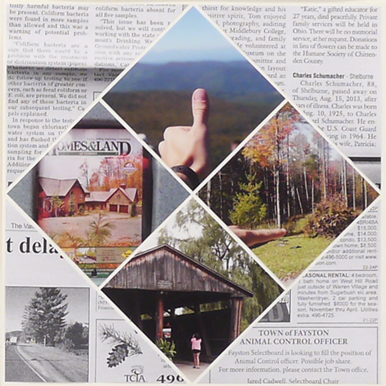 The patchwork technique is ubiquitous in Vermont in the form of quilts. Transferred to paper, I made quilts in the three colors of the landscape: the green of the forests, the blue of Lake Champlains and the red of the leaves during the “Indian Summers”. The top and bottom are framed by maps of Lake Champlains and the mountainous Mad River Valley. In between there are copies of newspaper clippings from the “Valley Reporter” and photos from the trip sorted by color.